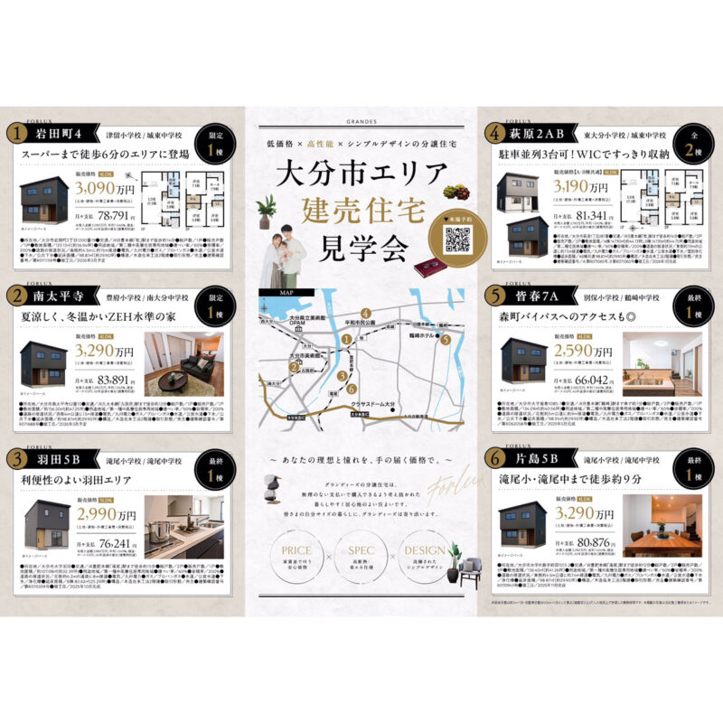 中面では、大分市エリアに点在する建売住宅を比較しやすいよう、グリッドレイアウトで整理。